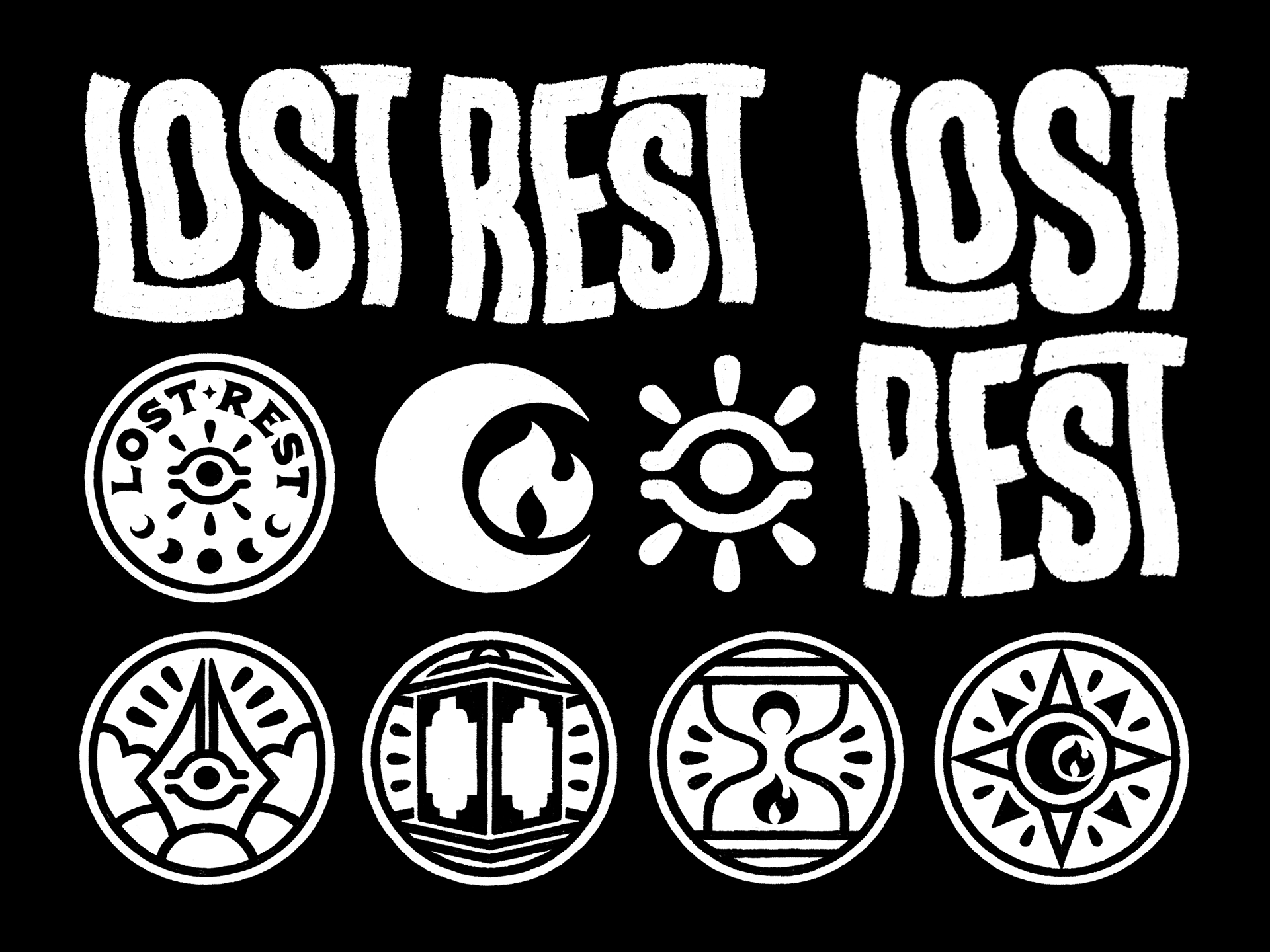 Initial branding elements for Lost Rest: my artist identity and brand. While I will be using these elements for merch and other designs, the elements are meant to merely inform how the brand can be expressed rather than serve as the graphics, themselves, in every case. I hope to create a brand in which my identity design can be drawn by hand or reinvented as I see fit for any given piece. So rather than copying and pasting these graphics every time I want to show my logo, these graphics can serve as more of a basis or guideline; establishing tropes, symbols, and motifs that can carry on into other works in a natural, organic way. You can start to see examples in my recent work, such as the way I write my handle, use of recurring symbols and motifs, and hand drawn recreations of the Sigils and other things.